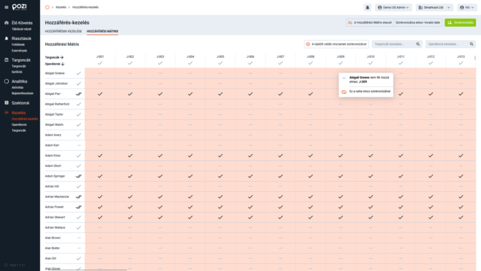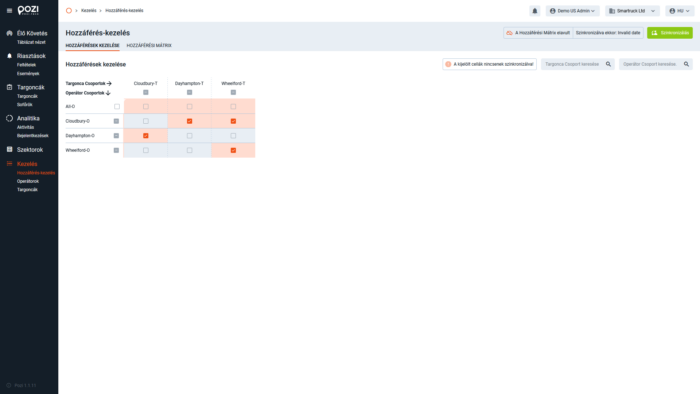 A webes felületen a jogosultságok a Kezelés / Hozzáférés-kezelés menüben konfigurálhatók, a targoncák és az operátorcsoportok összekapcsolására szolgáló mátrix segítségével. Ezek a beállítások a „Szinkronizálás” zöld gombra kattintva kerülnek feltöltésre a szerverre (2. szint).