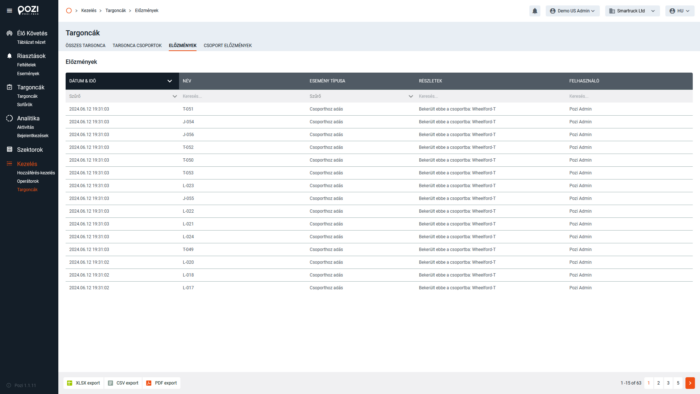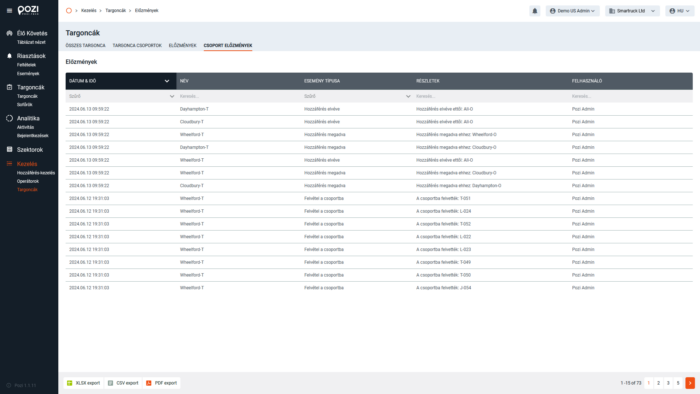 Az „előzmények” menüpontra kattintva megnyitható az aktuálisan vizsgált entitástípushoz vagy csoporthoz kapcsolódó szerkesztési előzmények listája. A listában minden hozzáadás, törlés és módosítás megtalálható időbélyeggel és a változtatást végző felhasználó nevével.