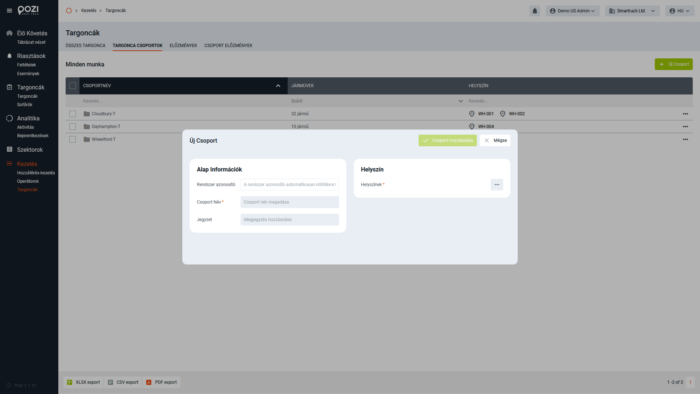 Új csoport létrehozásához kattintson a zöld „Új csoport” gombra a Targoncacsoportok képernyőn! Az előugró menüben: